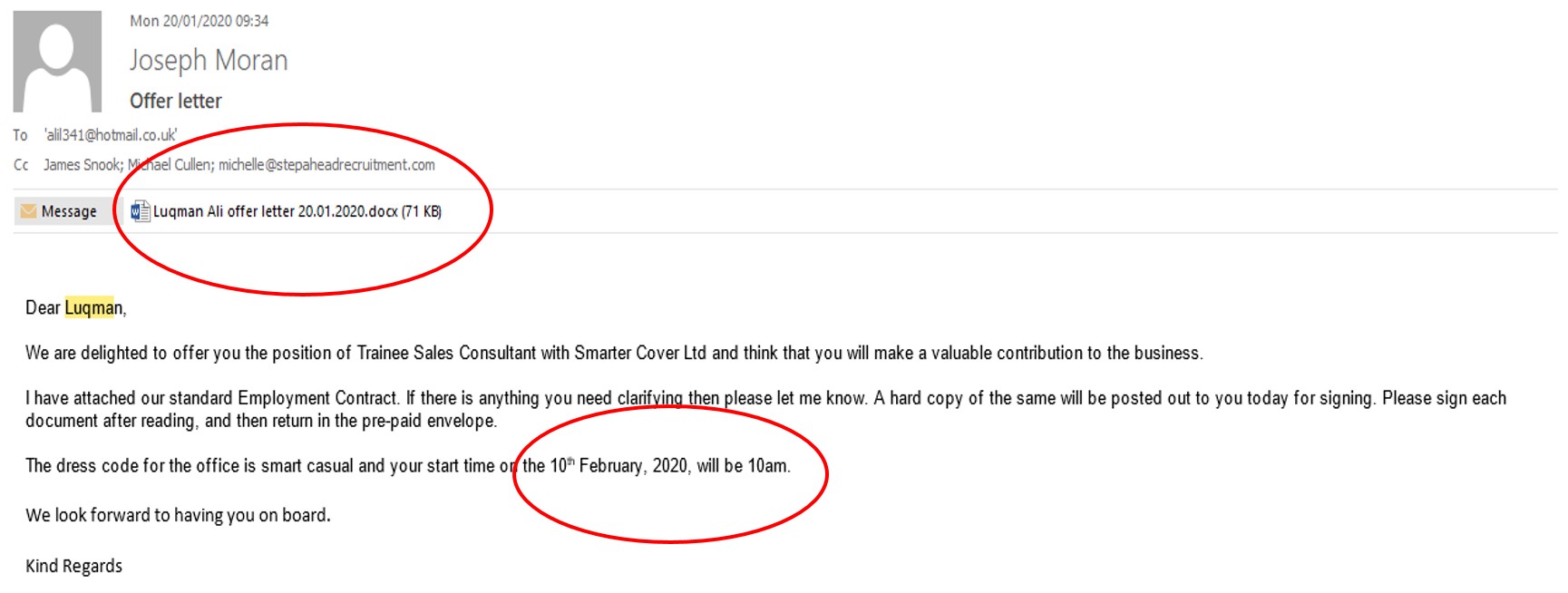 This is a typical example of the 'offer letter' which is sent by email first. Details about the dress code and the time on the first day is included. A copy of the 'offer letter' will be posted to them on the same day. The new starter is advised to send back the completed contract as soon as possible so that they can be added onto the HR system along with their documents.