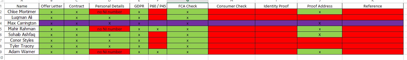 The spreadsheet is designed for organisational purposes and so I can keep on top of who needs what. I save every 'new starters' list in my documents as a record.