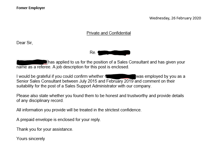 Once the employee has handed in their details, we will sent a reference request to their previous employer. We do this by locating their CV and emailing the employer. This is an example of the template: