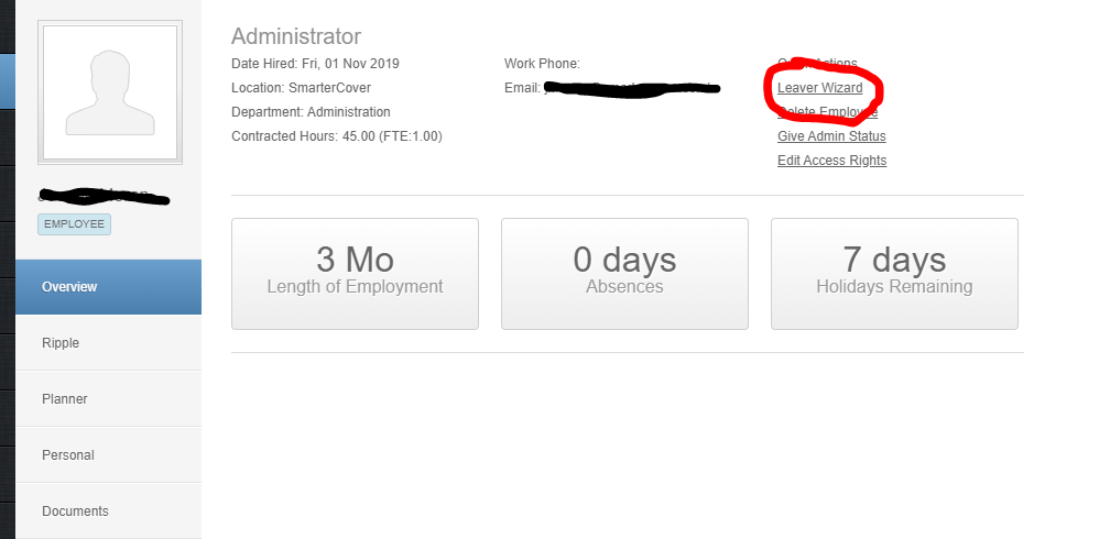 The next step in this process is to organise the employee's information on the HR system. This process of removing someone compared to setting someone up requires less work and time. Simply locate the employee and click on 'leaver wizard' at the top of their page. This is circled in the photo below.