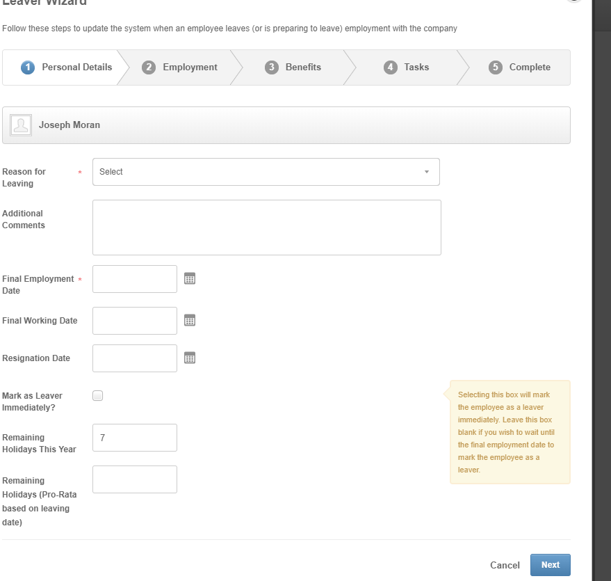 Likewise with setting a new employee up on the HR system, the leaving process has four sections which need to be completed. These sections are important for payroll and confirm the dates of exit. On the day that they leave the HR system will automatically remove them.