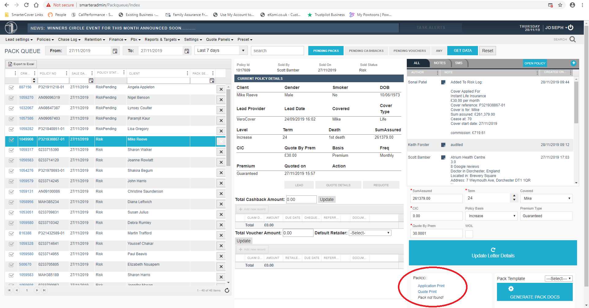 If the pack is not found all you have to do is click on the bottom right corner where it says �generate pack docs�. The system will automatically load up the documents and all you will have to do is print off the papers.