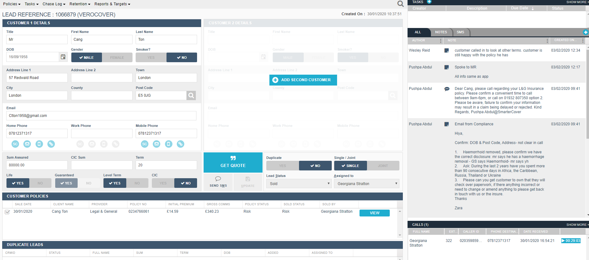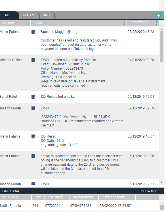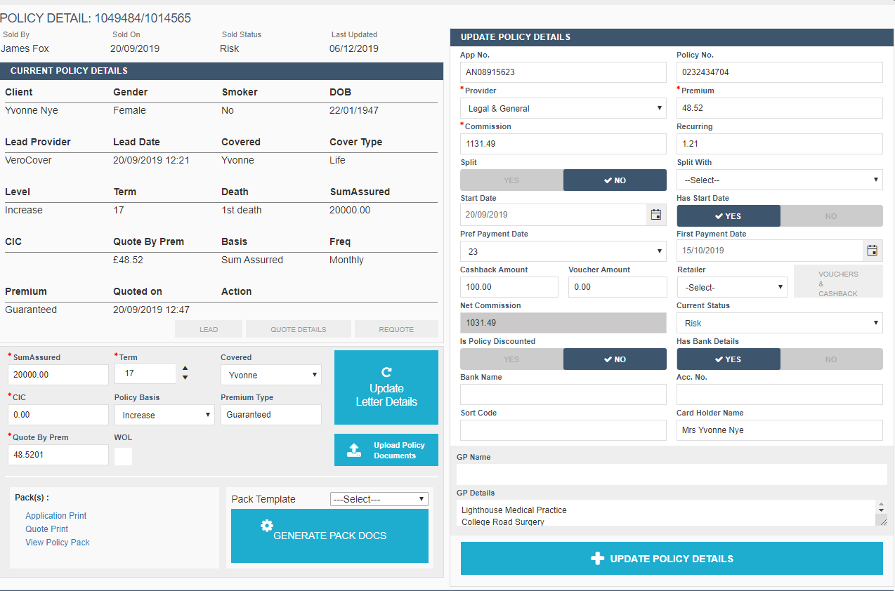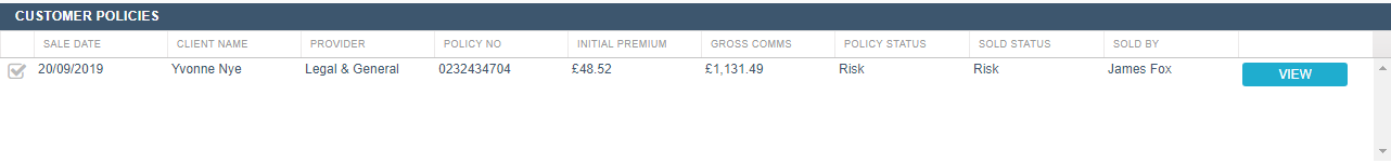 So first on the CRM open up the customer�s policy by clicking on blue View button right at the bottom of the page. This will bring up all the clients details such as their bank details and policy number.