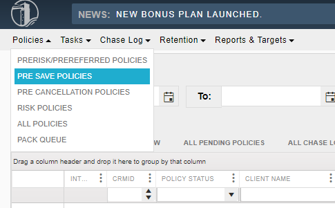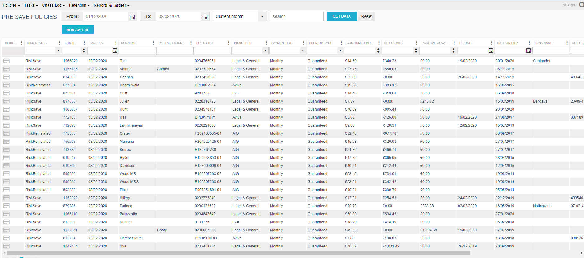 When the pre save policies page comes up, it shows a list of the CRM ID , policy number and the clients surnames.